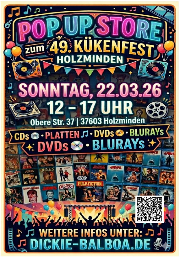 Zum 49. Kükenfest in Holzminden zieht unser Pop Up Store wieder für ein paar Stunden in die Geschäftsräume in die Obere Str. 37 ein. Von 12-17 Uhr könnt Ihr zwischen Tausenden von Platten, CDs, DVDs und BluRays wählen. Wir haben eine riesige Auswahl an günstigen Angeboten aus allen Genres.